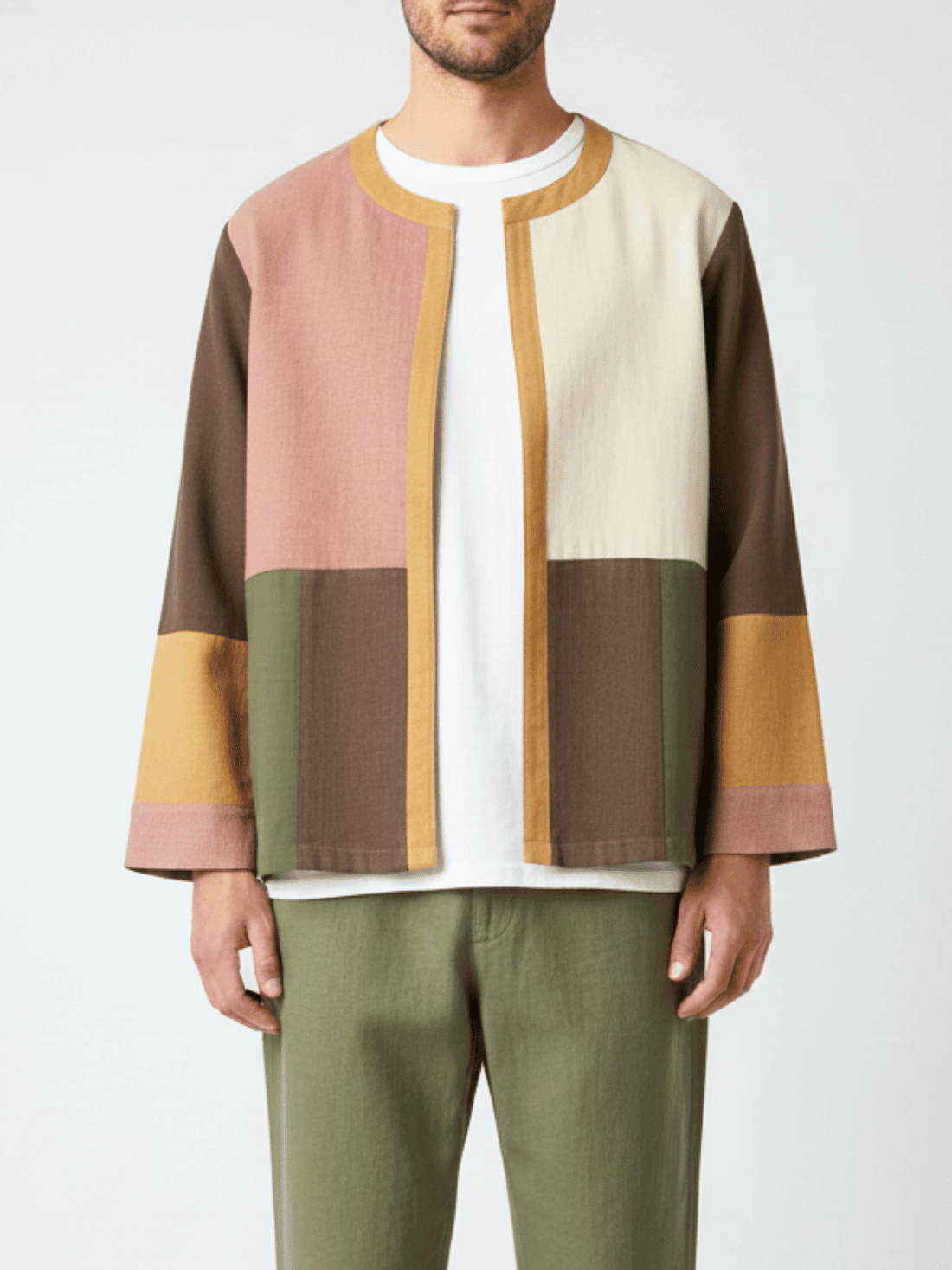 Elevate your wardrobe with our upcycled cotton-linen colour block jacket, featuring a clean round neck...