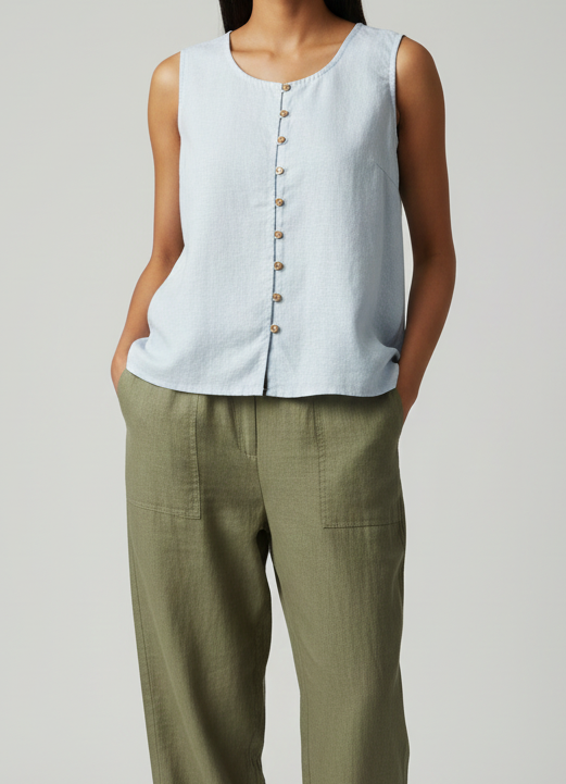 Stay cool and stylish with our women's sleeveless button-down top, crafted from breathable cotton-linen fabric...