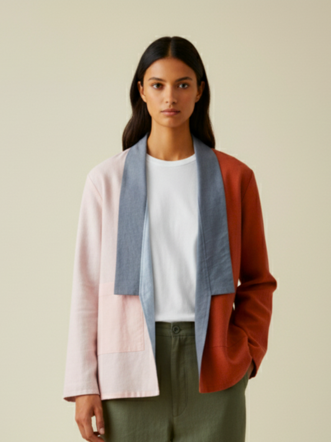 Elevate your wardrobe with our upcycled cotton-linen colour block jacket, crafted with a clean round...