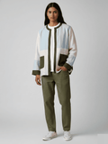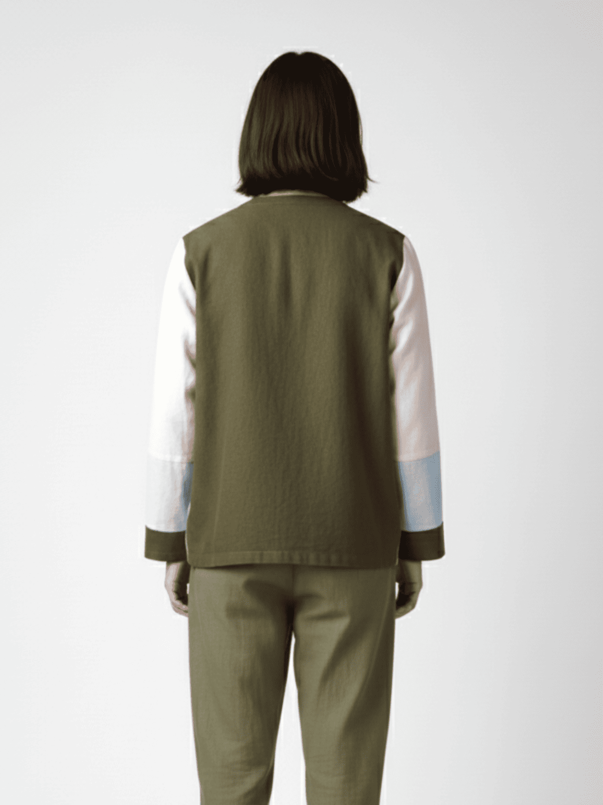 A soft expression of structure and ease — this cotton-linen colour block jacket features a clean round neck and minimal detailing that lets the colours speak.