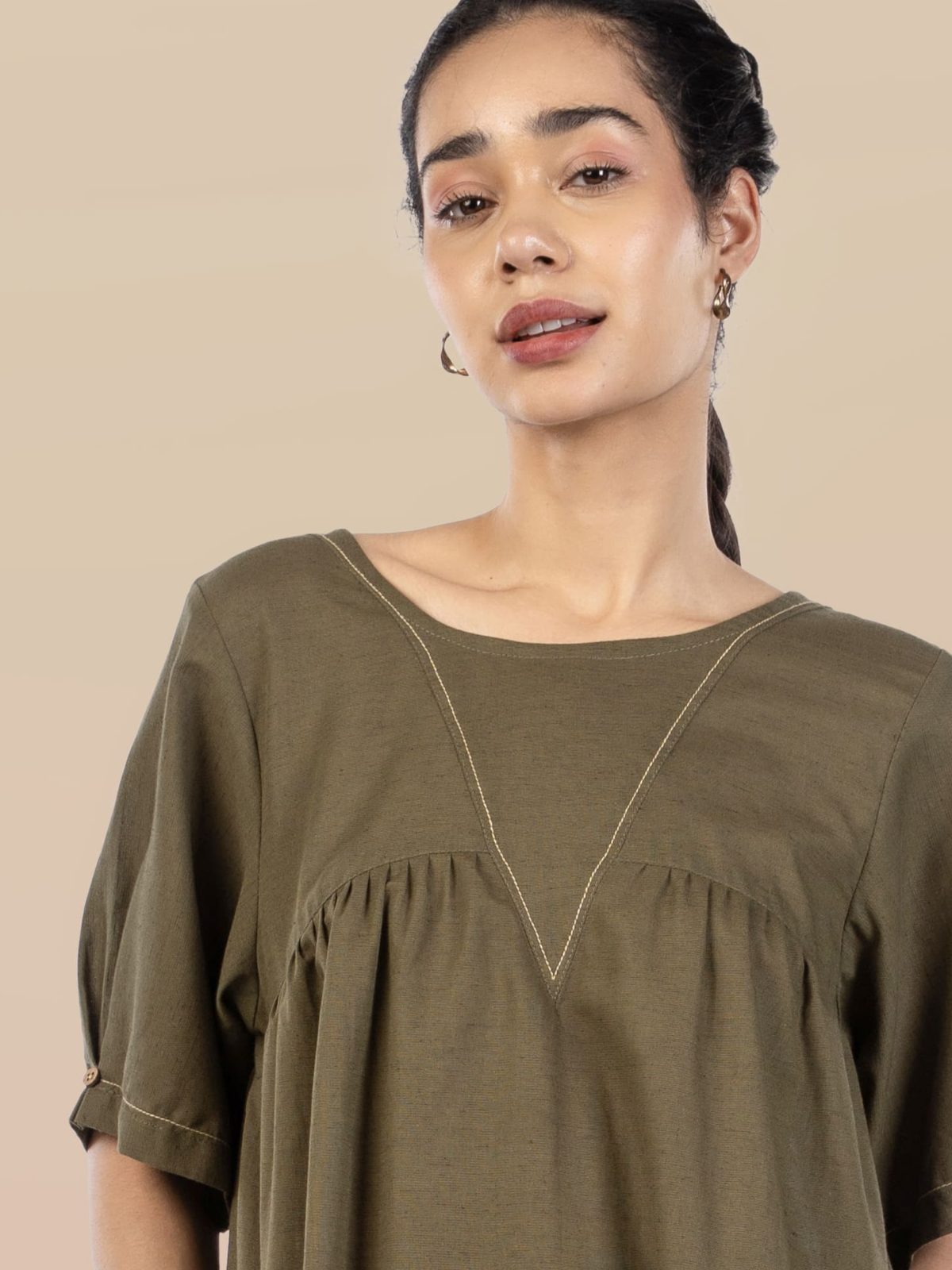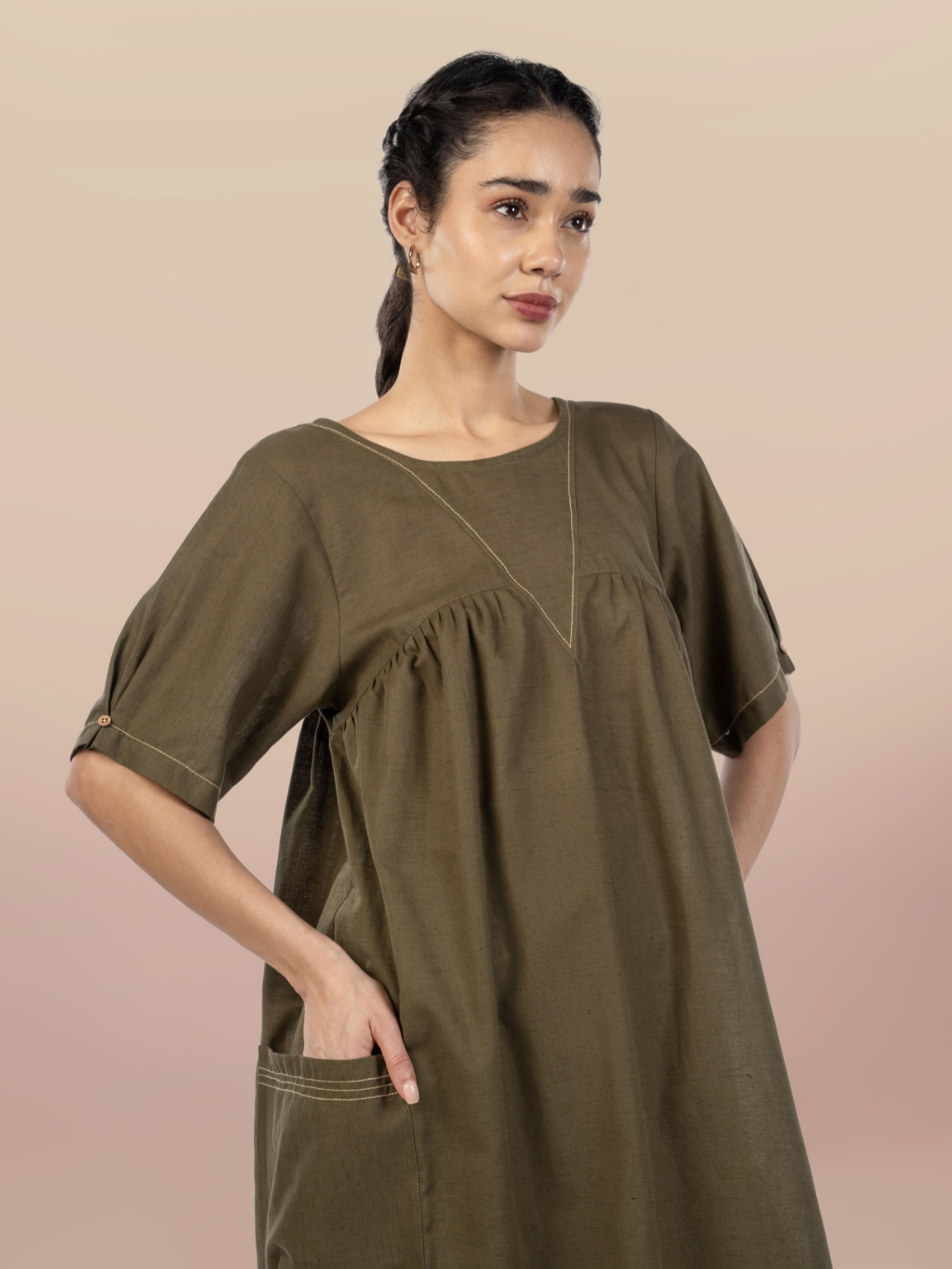 Redefining effortless sophistication, this olive cotton-linen co-ord set blends timeless design with everyday comfort. The midi-length tunic features a flattering bib front and midriff yoke, enhanced with practical patch pockets for functionality. Deep armholes and box-pleated sleeves create graceful movement, while the round neckline and minimal contrast embroidery add a touch of subtle elegance.