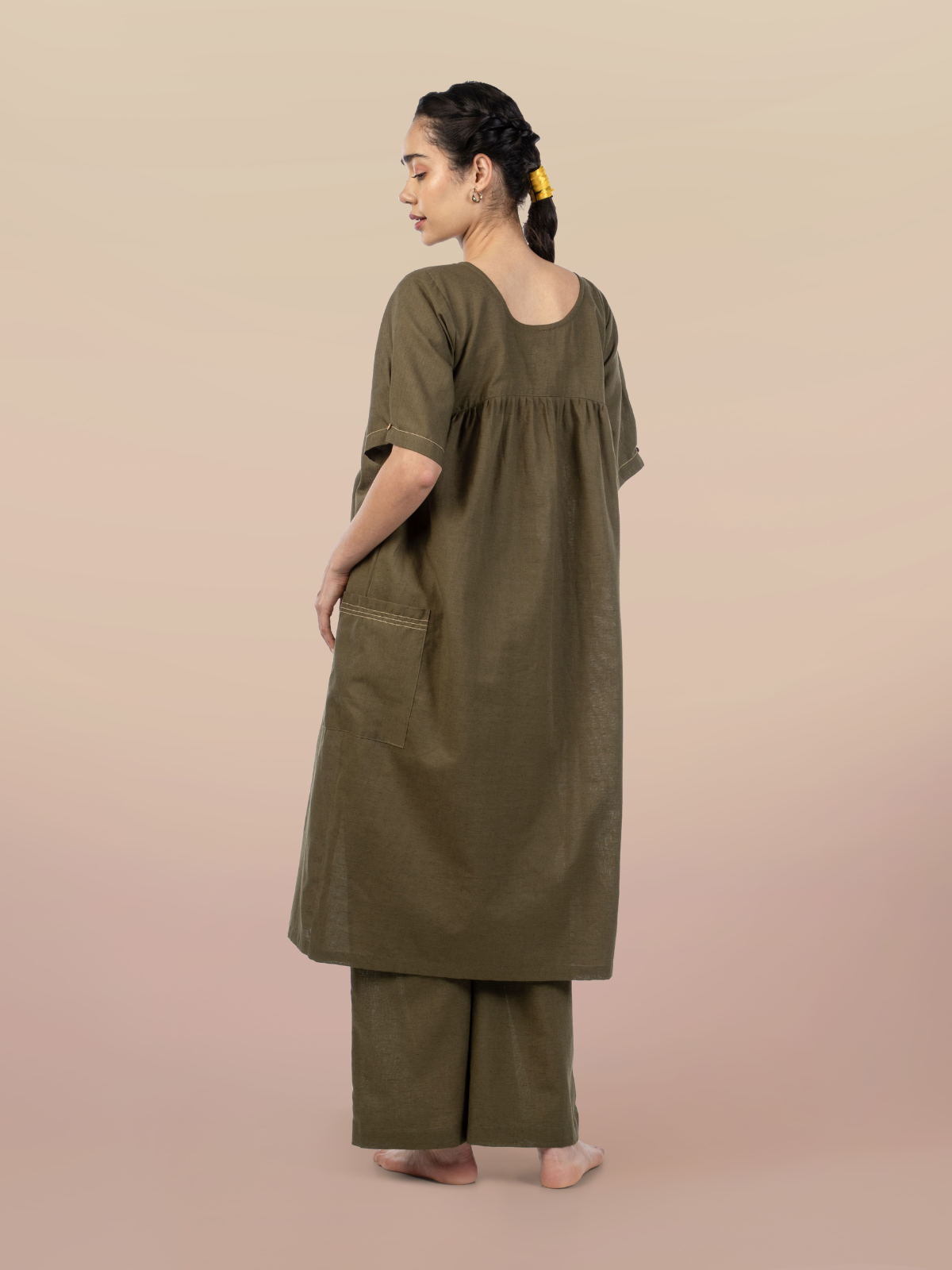 Redefining effortless sophistication, this olive cotton-linen co-ord set blends timeless design with everyday comfort. The midi-length tunic features a flattering bib front and midriff yoke, enhanced with practical patch pockets for functionality. Deep armholes and box-pleated sleeves create graceful movement, while the round neckline and minimal contrast embroidery add a touch of subtle elegance.