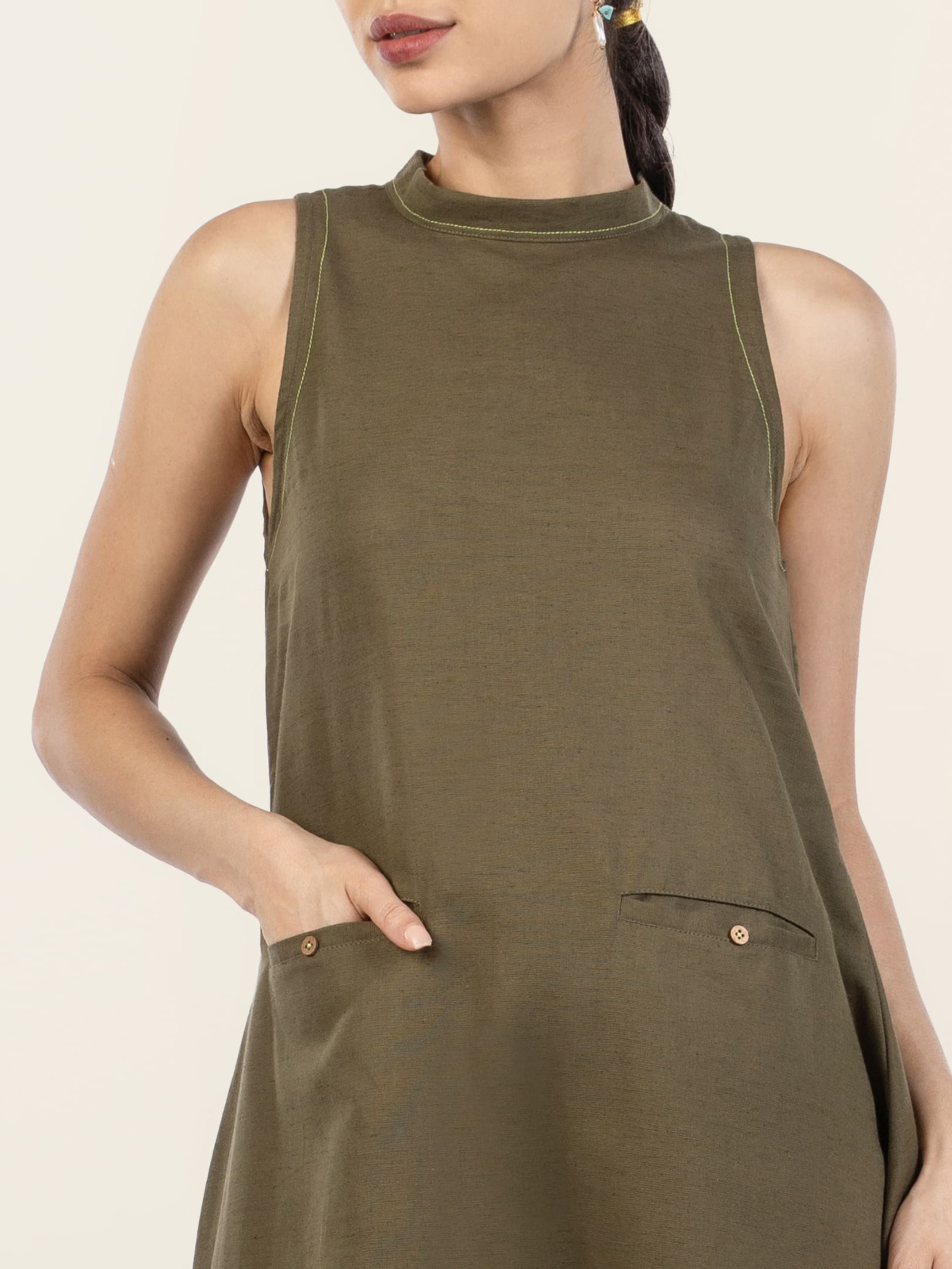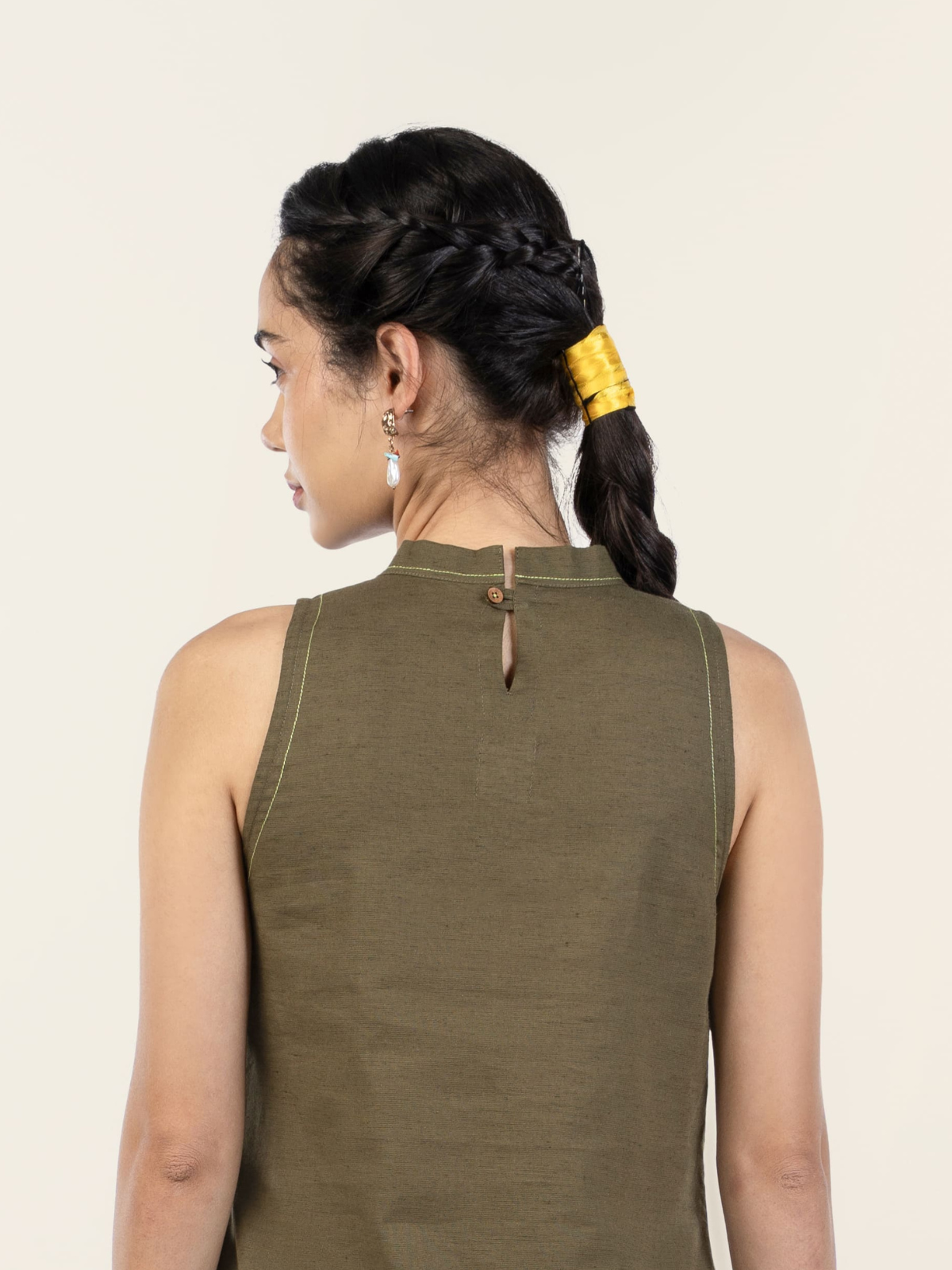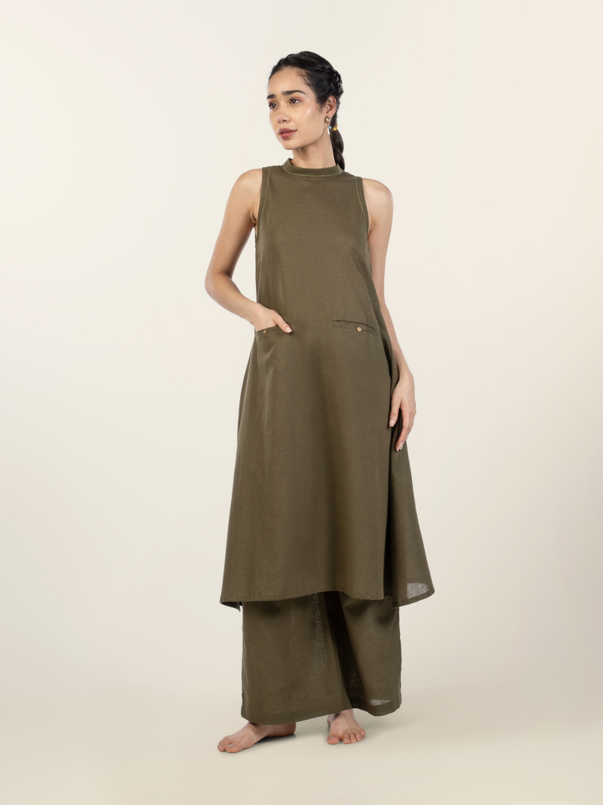 Effortlessly refined and contemporary, this A-line midi co-ord set brings modern structure to timeless simplicity. The sleeveless tunic features a collared halter neckline that frames the shoulders beautifully, while front pockets add everyday functionality. Delicate contrast-color embroidery lends a handcrafted touch, elevating the minimalist silhouette with subtle detail.