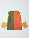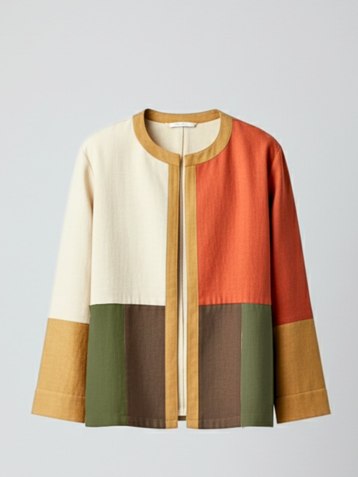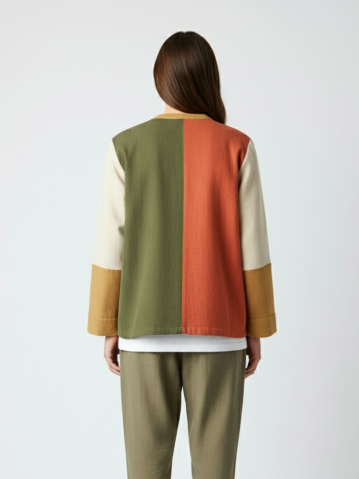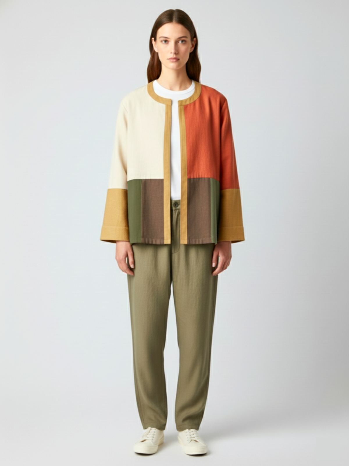 Elevate your wardrobe with our upcycled cotton-linen colour block jacket, featuring a clean round neck and minimal detailing that lets its soft, earthy tones take center stage.