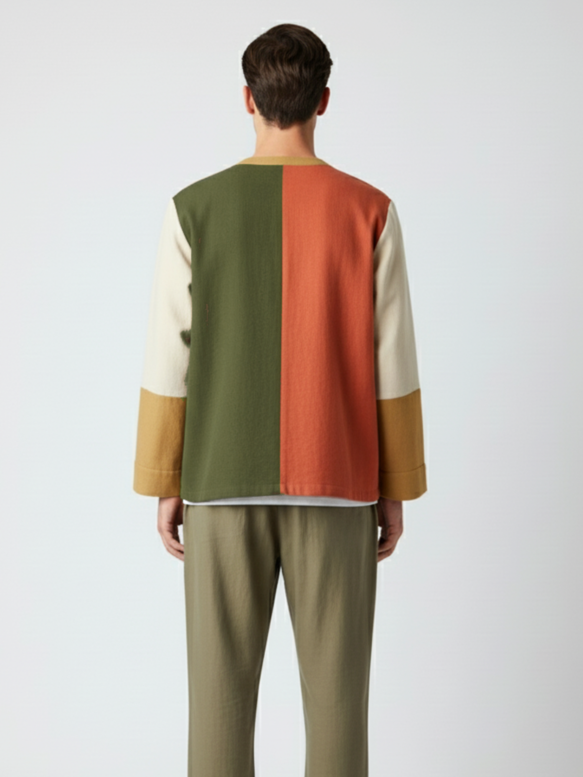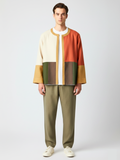Elevate your wardrobe with our upcycled cotton-linen colour block jacket, featuring a clean round neck and minimal detailing that lets its soft, earthy tones take center stage.
