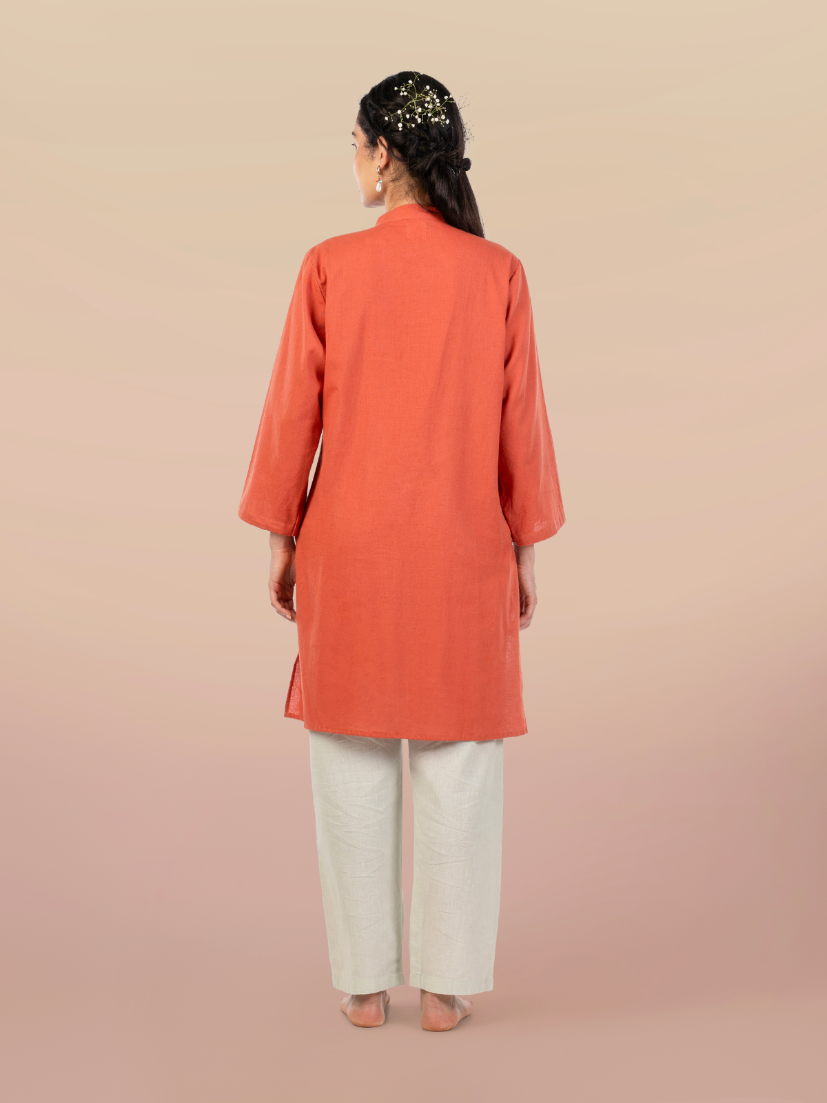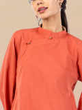 Redefining everyday elegance, this co-ord set pairs a modern Tibetan-collar tunic with straight-fit trousers for a look that’s both versatile and refined. The tunic, crafted in breathable cotton-linen, offers a clean neckline, relaxed cut, and naturally polished silhouette. Subtle button details enhance its minimalist design, while the lightweight fabric ensures ease and comfort throughout the day.