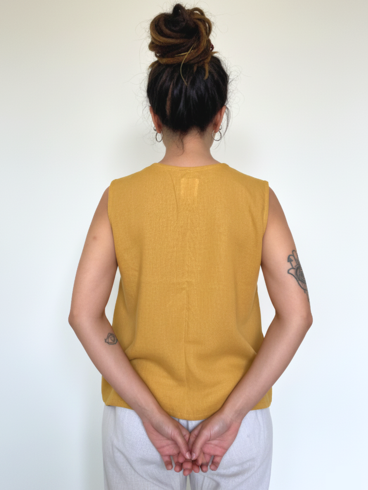 Stay cool and stylish with our women's sleeveless button-down top, crafted from breathable cotton-linen fabric for all-day comfort. Designed with a round neckline and front wooden buttons, this minimalist summer top offers a clean, versatile look that’s perfect for both casual and semi-formal occasions. The lightweight fabric ensures easy movement and a soft drape, making it your go-to choice for work, travel, or everyday wear. Pair it with trousers, skirts, or shorts for effortless elegance.