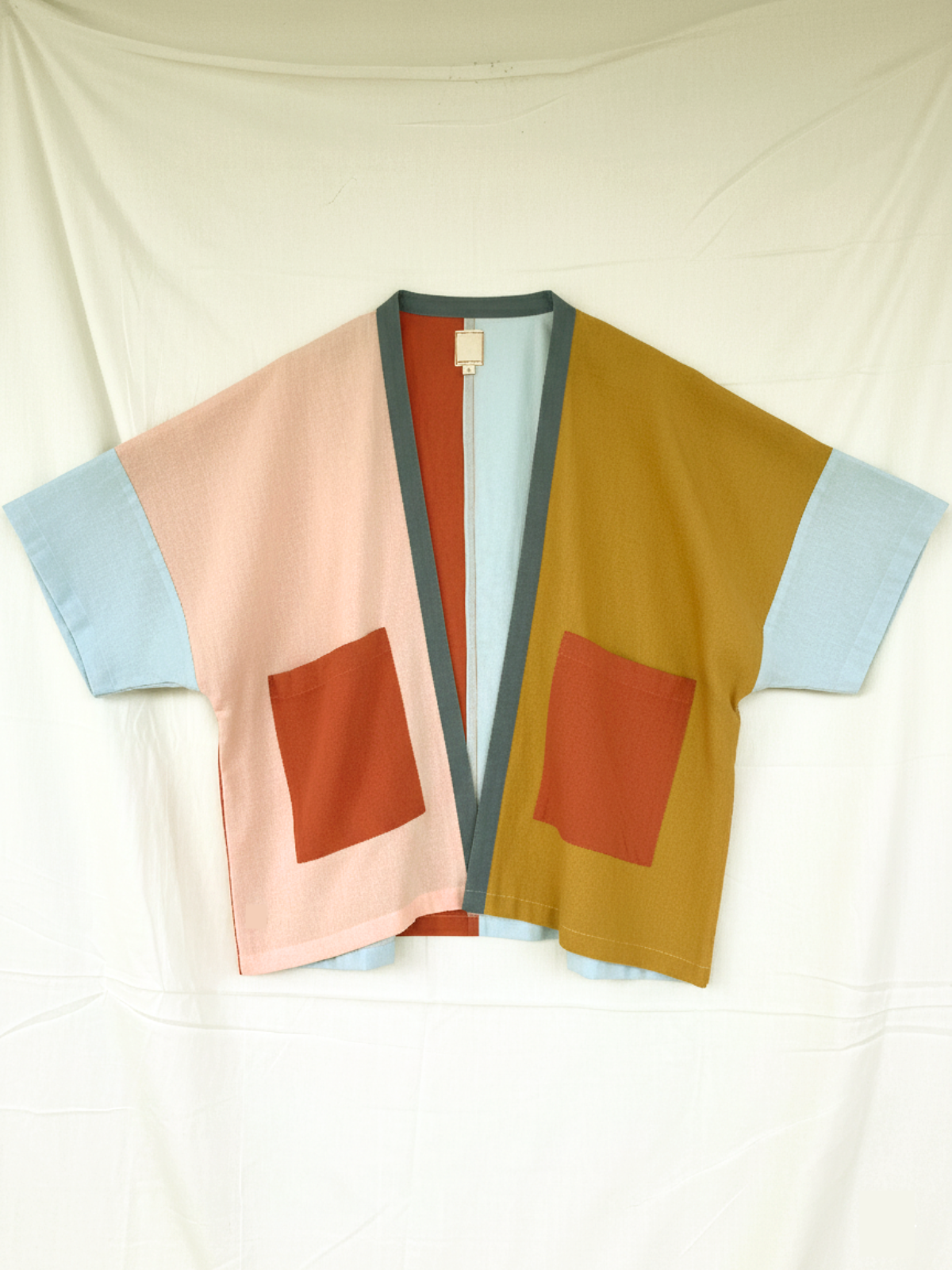 Crafted in soft, breathable cotton-linen, this kimono-style jacket brings together relaxed structure and modern color play.