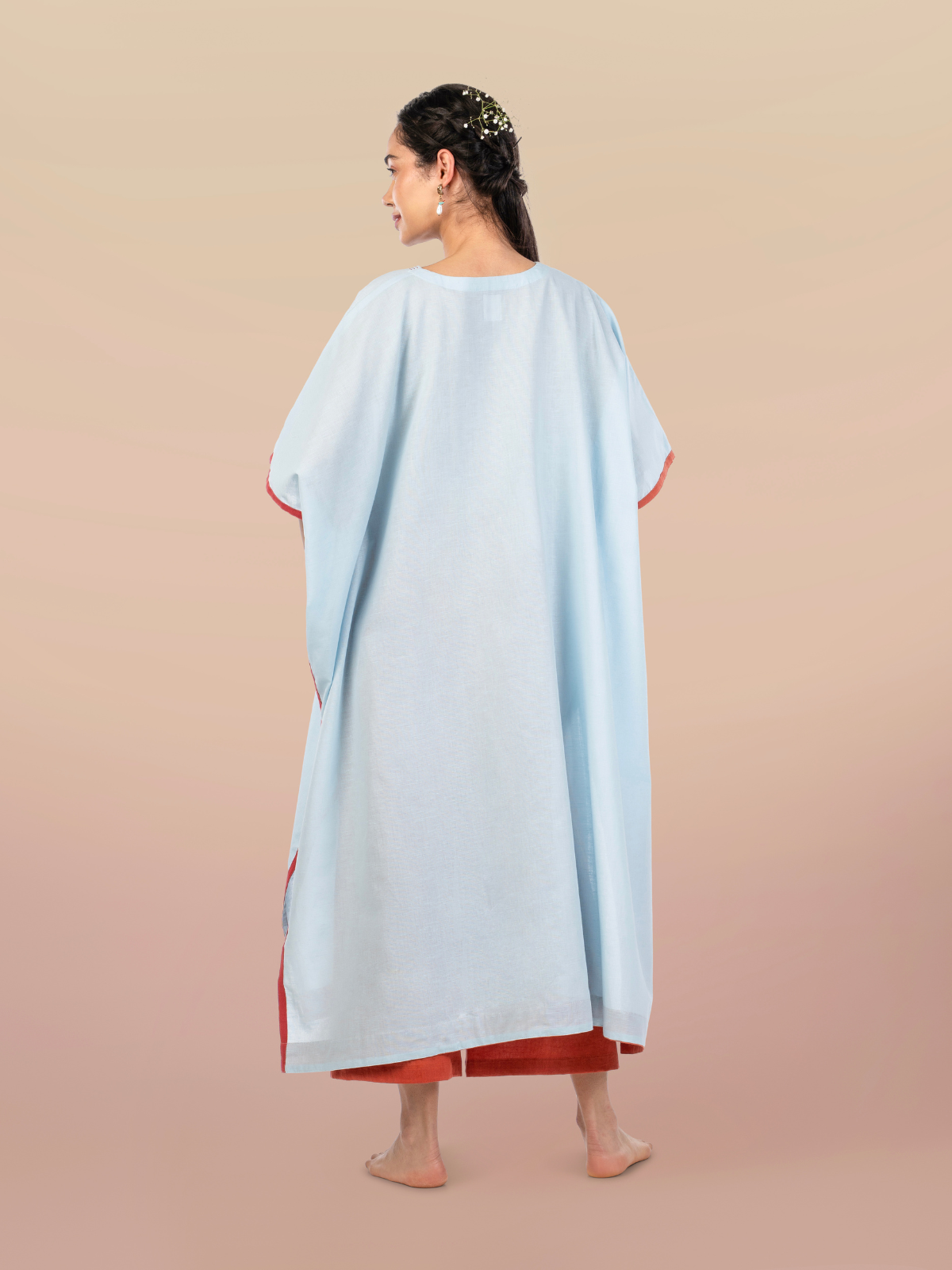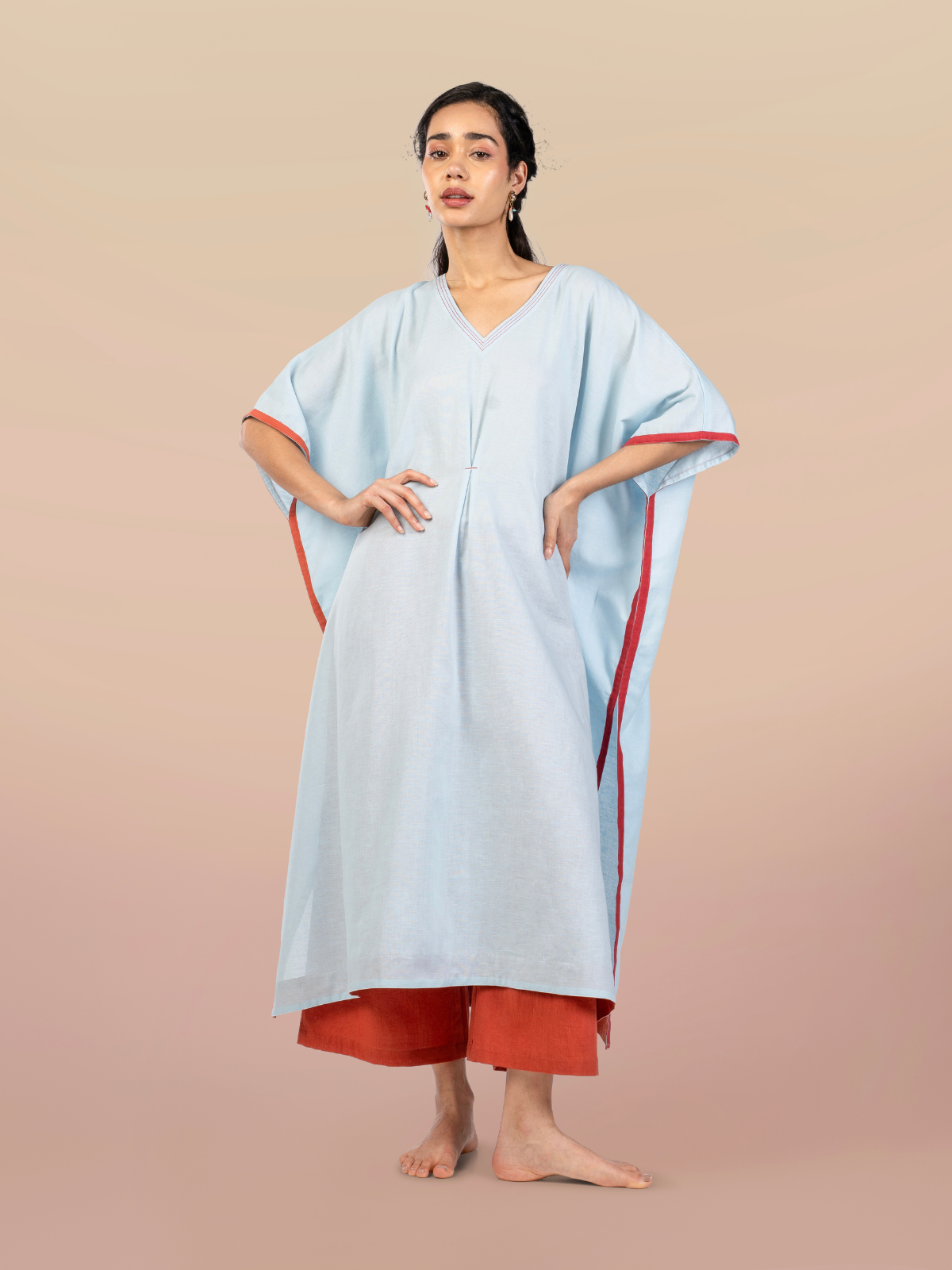 Effortlessly elegant, this midi-length Kaftan combines comfort with subtle artistry. Crafted in breathable cotton-linen, it features an embroidered V-neckline and contrast-colored binding that adds a refined touch to its relaxed silhouette. Lightweight and flowing, this Kaftan is perfect for casual outings or garden days