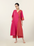 A contemporary spin on a timeless silhouette, this cotton-linen Angrakha tunic features wrap-around front panels secured with a button for ease and elegance. The vibrant combination of pink and red creates a striking contrast, while the V-neckline, quarter sleeves with cuffs, and thoughtfully added pockets make it as practical as it is stylish. Crafted for comfort and movement, this tunic blends tradition with modern versatility — perfect for days when you want to feel both confident and graceful.