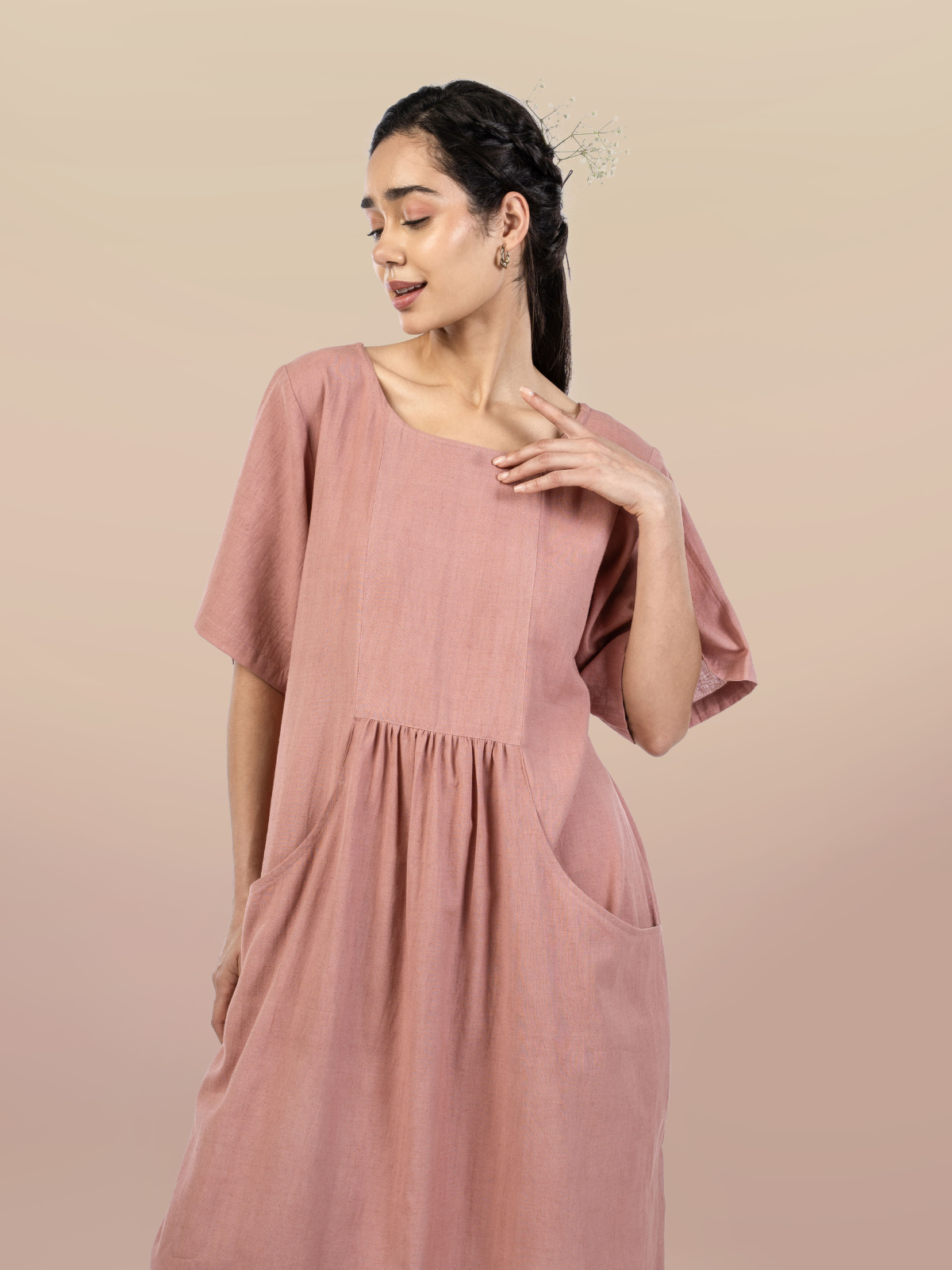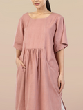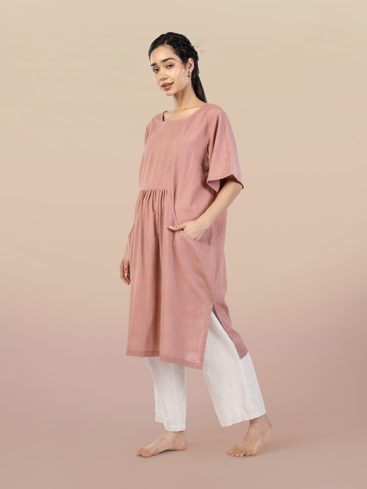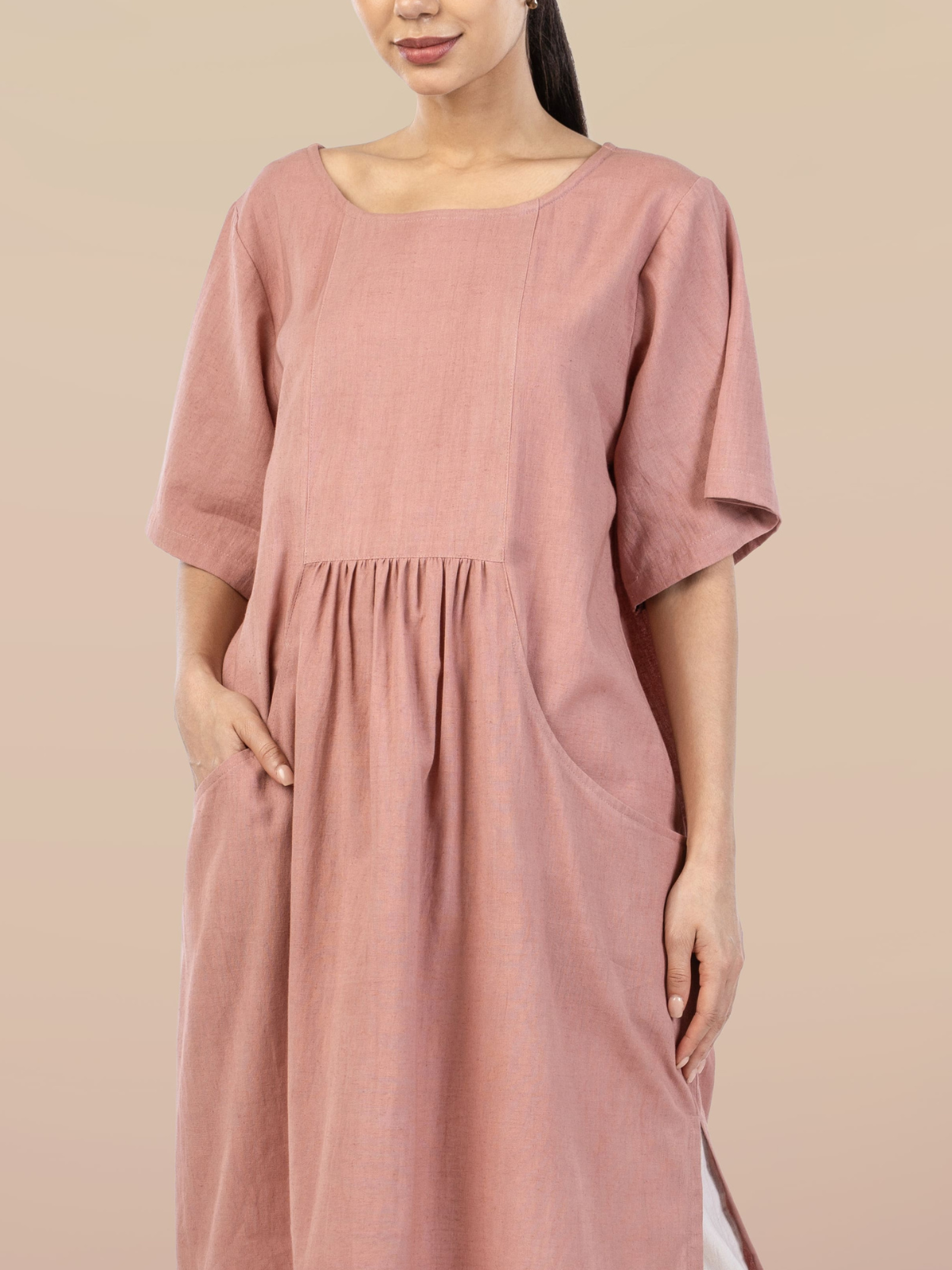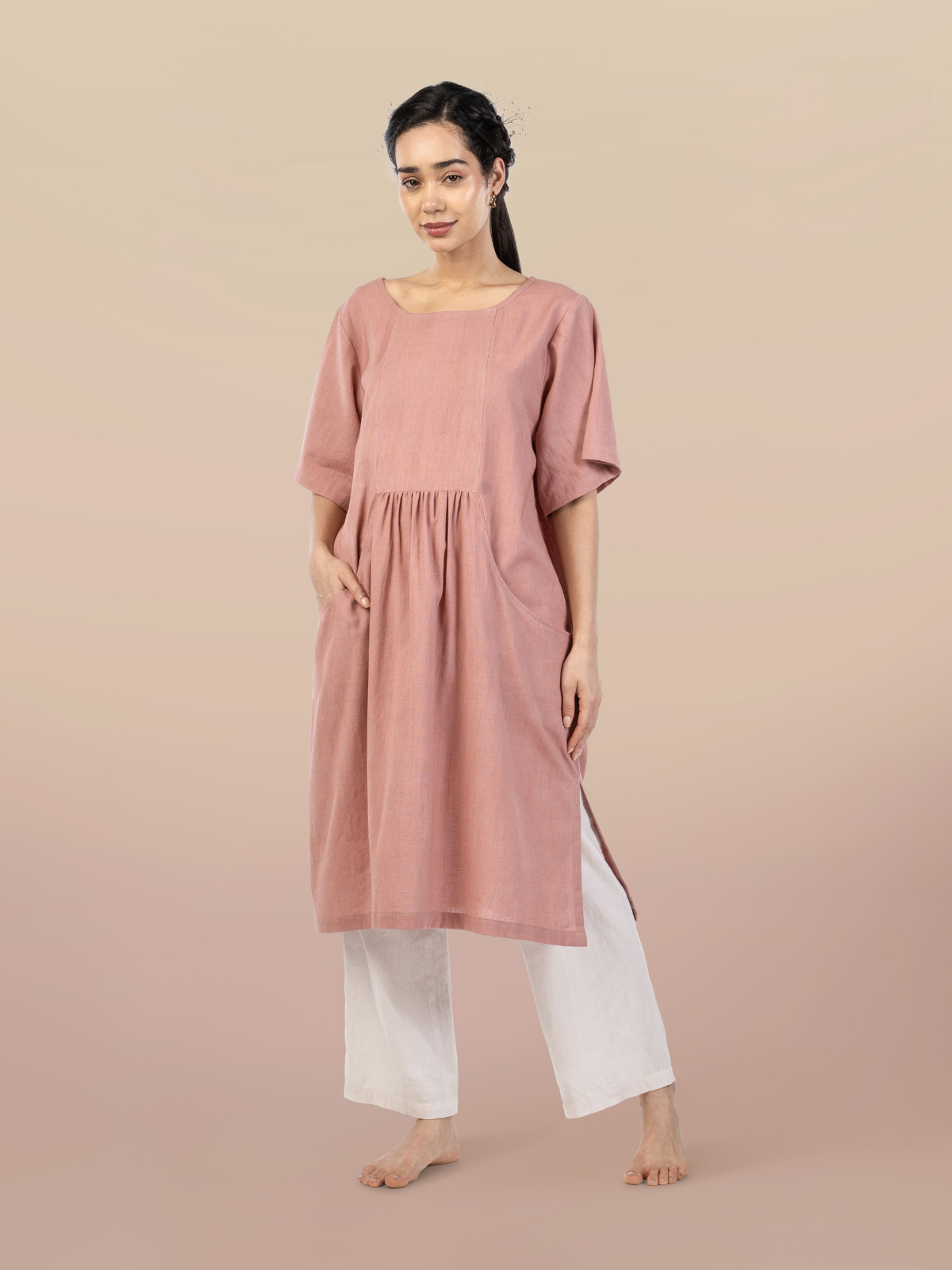 A cosy, grounded, and versatile piece that feels like a daily essential. With a relaxed silhouette, round neckline, half-sleeves, and practical pockets, it blends functionality with minimal style. Lightweight and breathable, it’s perfect for casual days, errands, or layered looks, offering a wardrobe staple that’s as practical as it is chic.