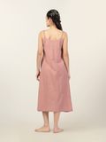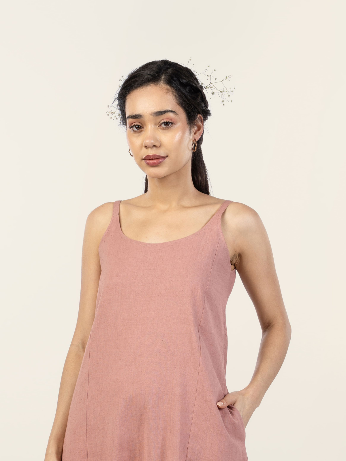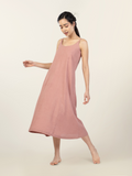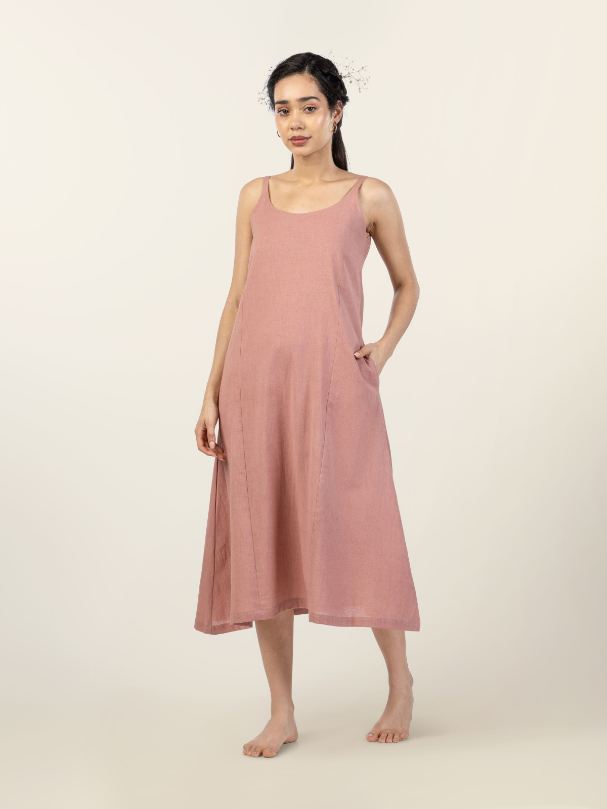 Bold in simplicity and elegant in form, this midi-length A-line dress is a wardrobe essential for the modern woman. Designed with slender straps and a minimal round neck, it offers a clean, refined silhouette that flows with effortless ease. Discreet pockets add practicality without compromising style, making it as functional as it is chic. Perfect for days when confidence and elegance need no embellishment. It is sleek, powerful, and timeless, reflecting bold minimalism.