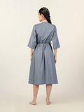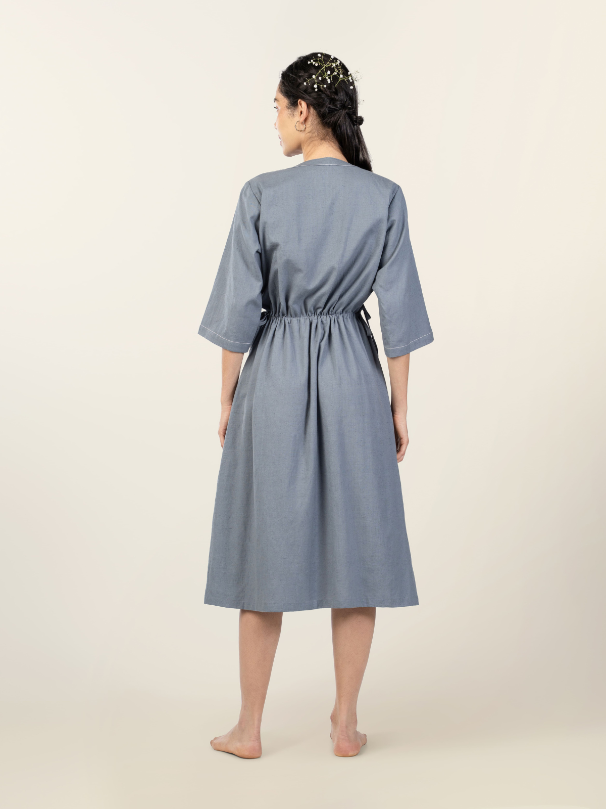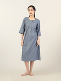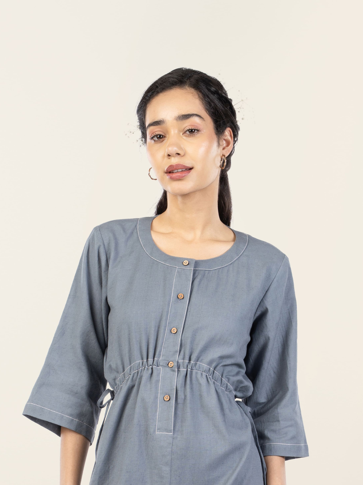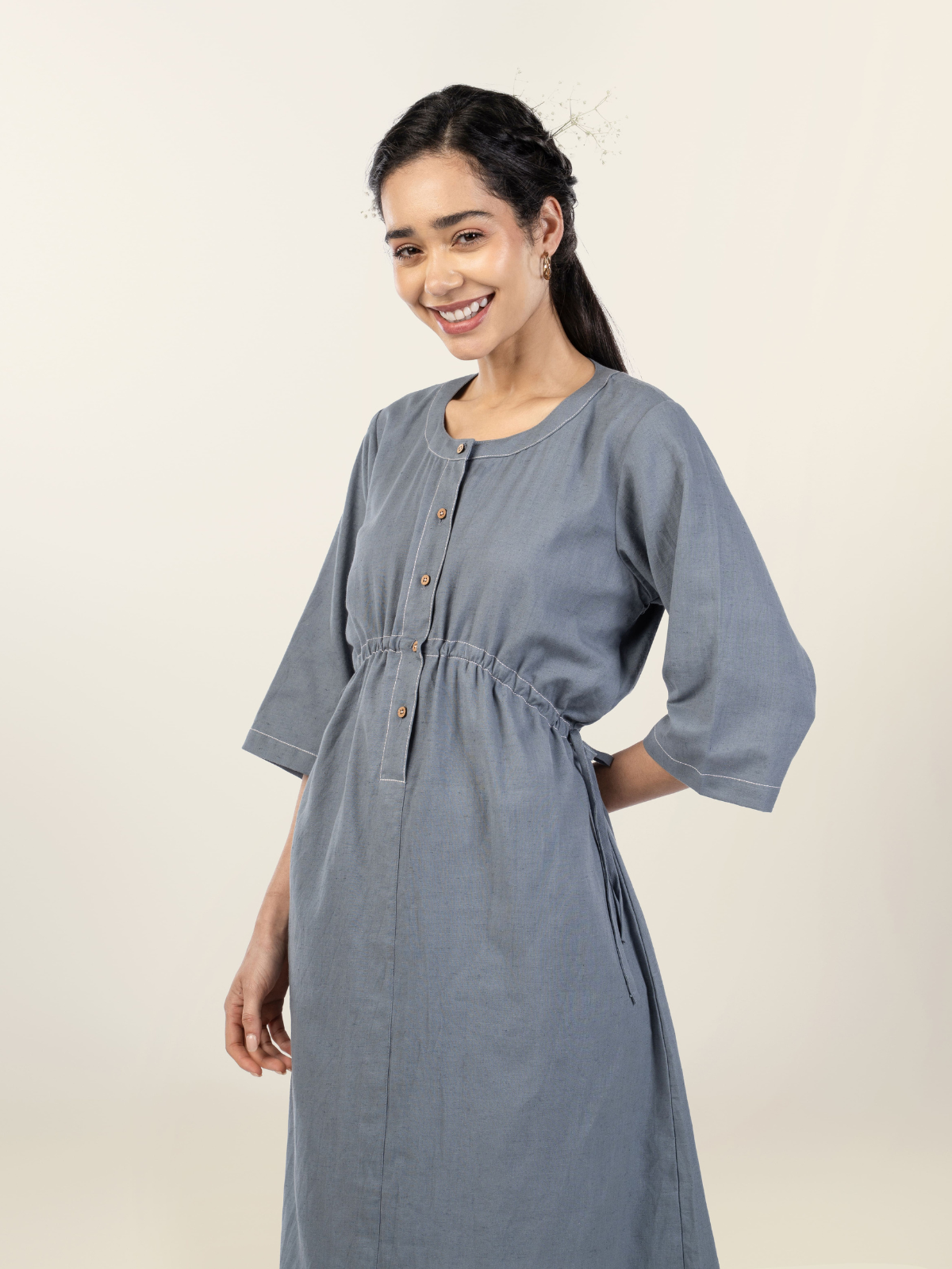 Easy elegance meets everyday comfort in this midi-length cotton-linen dress. Designed with a ruched drawstring waist that flatters the silhouette, it features quarter sleeves, a round neck, and a half-button front finished with natural wooden buttons. Minimal embroidery adds a subtle handcrafted detail, making this piece refined yet relaxed. Breathable and versatile, it’s a dress you’ll reach for on repeat.
